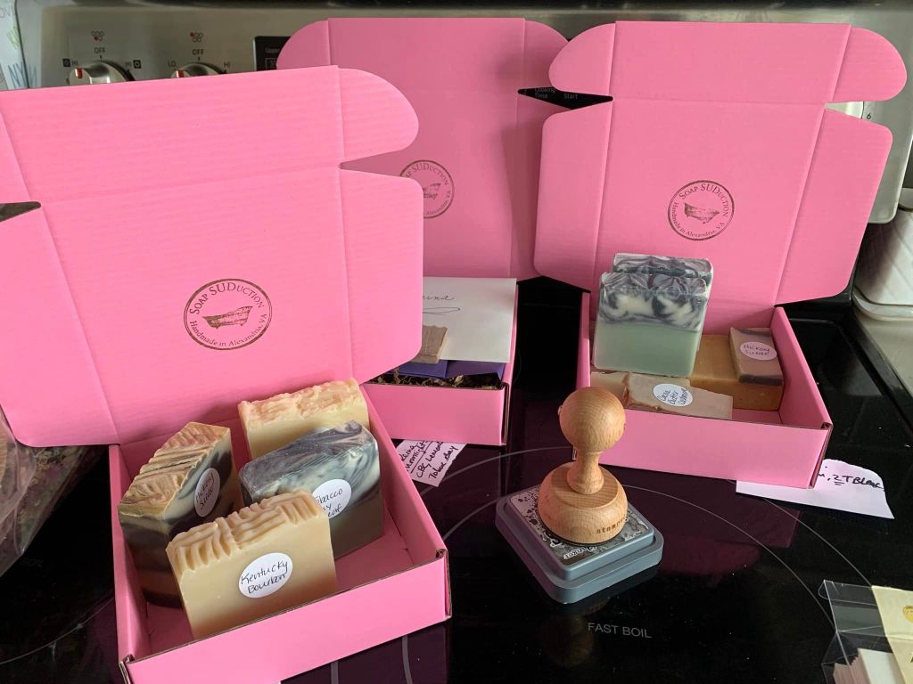 Everything I package now is paper or recycled paper product. I have my signature pink Soap SUDuction box with my stamp on the inside. Plus a piece of purple tissue paper to gather the soaps together, and a thank you card for marketing purposes.“